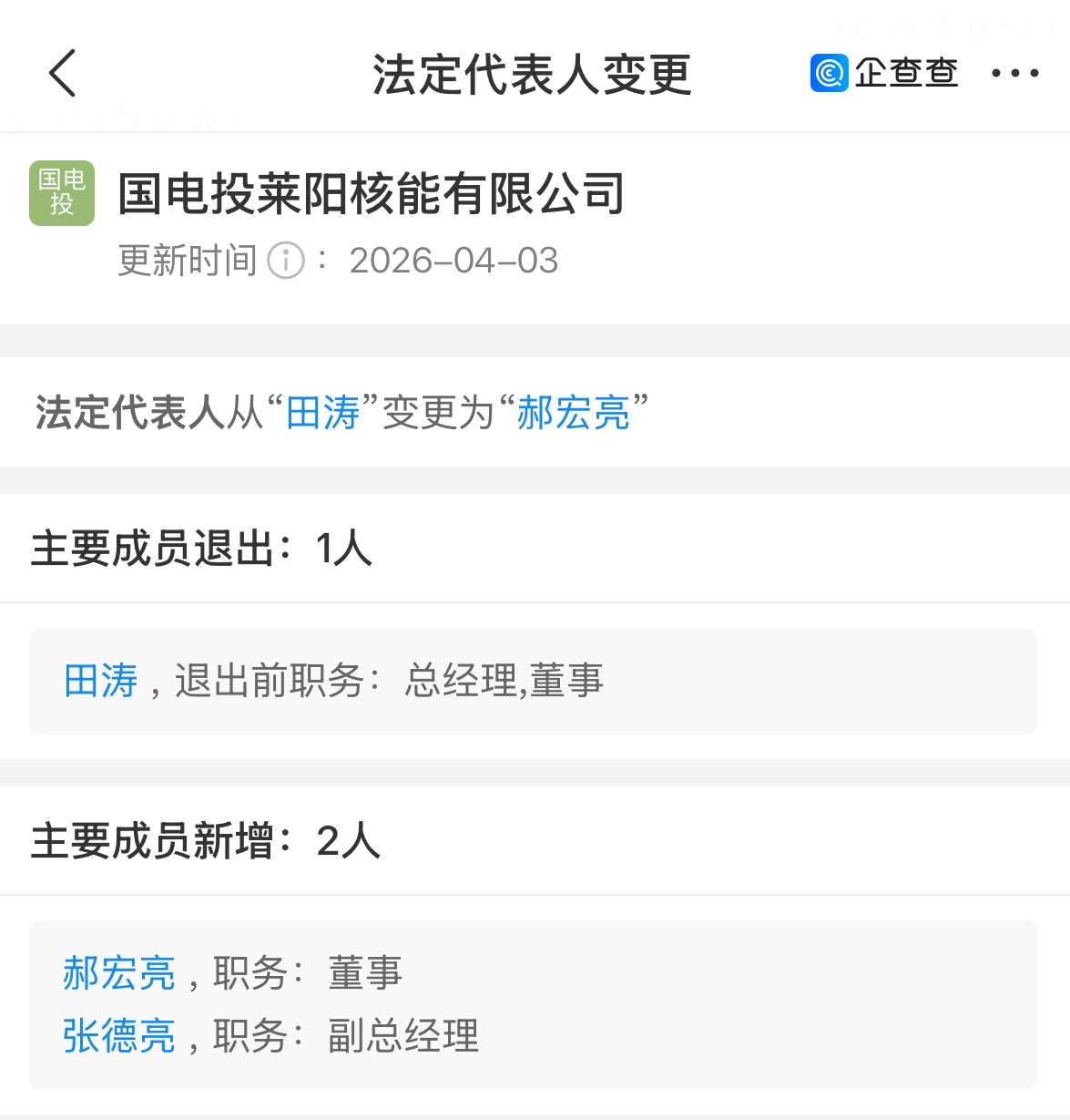企查查App显示,4月3日,国电投莱阳核能有限公司法定代表人由田涛变更为郝宏亮,田涛不再担任总经理、董事,郝宏亮目前为该公司董事,公司还新增副总经理张德亮。