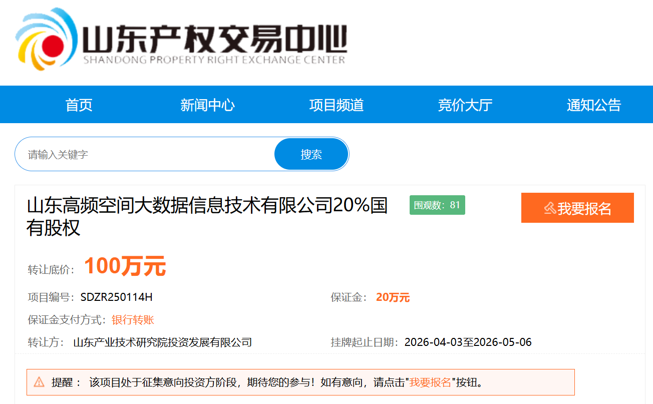 4月3日,山东高频空间大数据信息技术有限公司(下称“高频空间”)20%国有股在山东产权交易中心挂牌转让,转让底价100万元,转让方为山东产业技术研究院投资发展有限公司(下称“山东产研投”)。