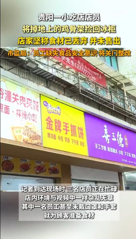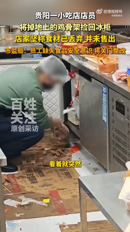 贵阳小吃店店员捡地上鸡骨架回冰柜,负责人改口称失误,市监局责令关门整改