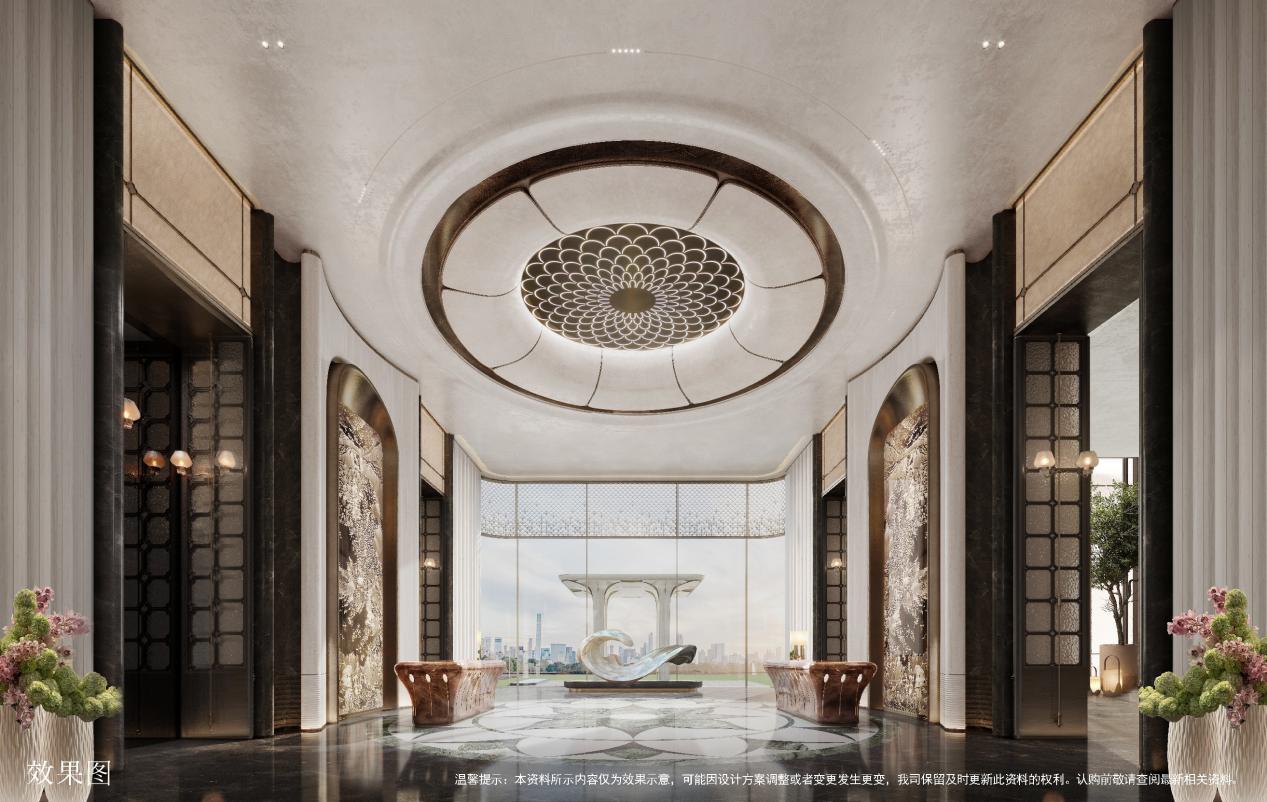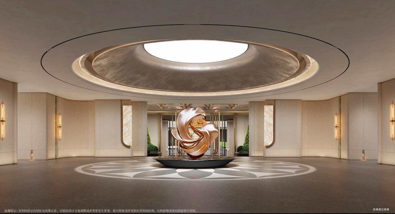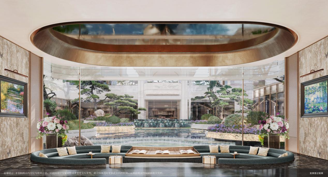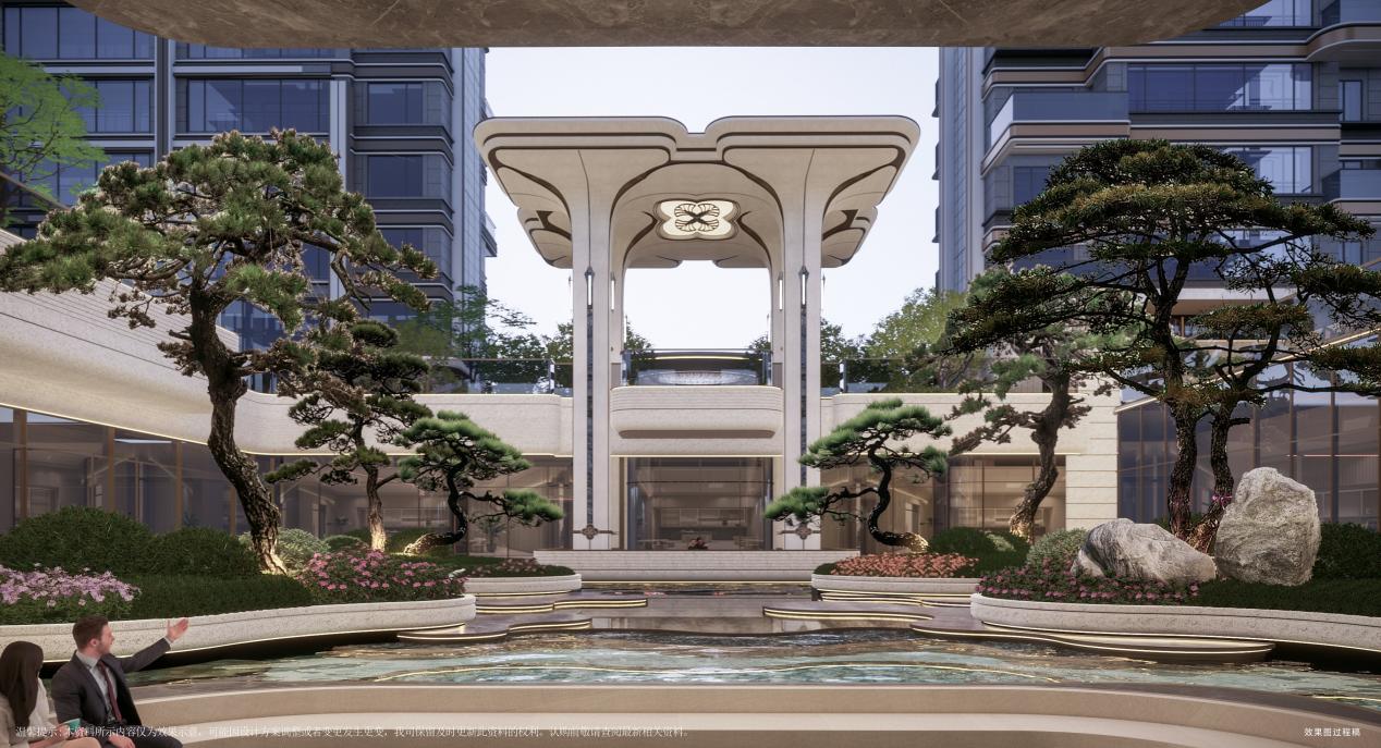 项目景观萃取东方礼序与自然美学精髓,打造“大境于礼”的沉浸式体验,每一处设计都堪称艺术之作。约 115 米超阔尺度的社区主入口直面金宇路,以中国古典建筑格局为灵感,层层递进的空间序列,将归家的尊贵感与仪式感拉满;大门口泮池内叠雕3900片龙鳞,波光粼粼间自成峯景,单是这一处的工艺成本,就足以令人惊叹。