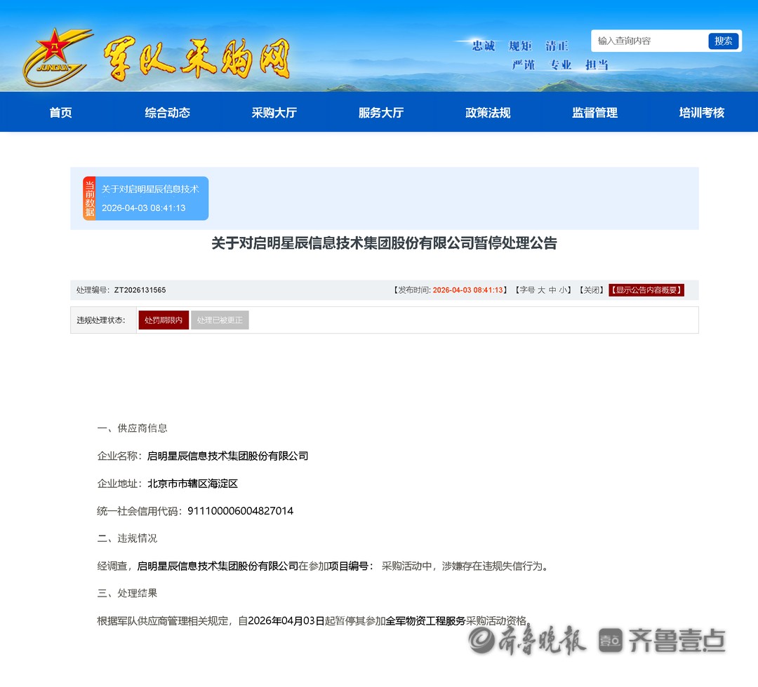 根据军队供应商管理相关规定,自2026年04月03日起暂停其参加全军物资工程服务采购活动资格。