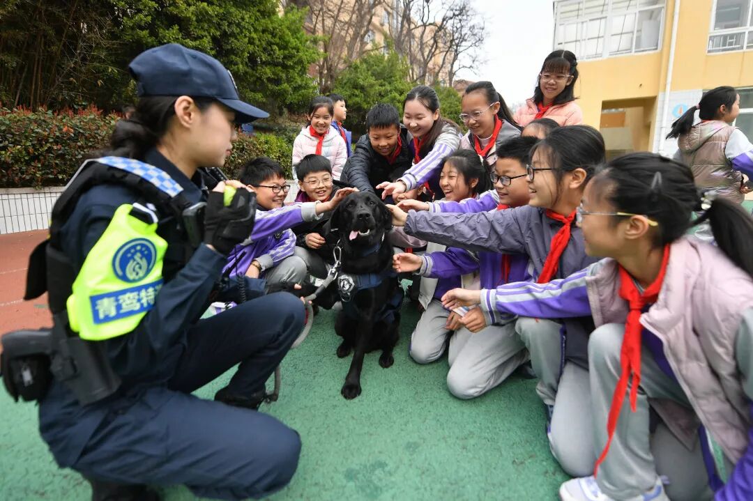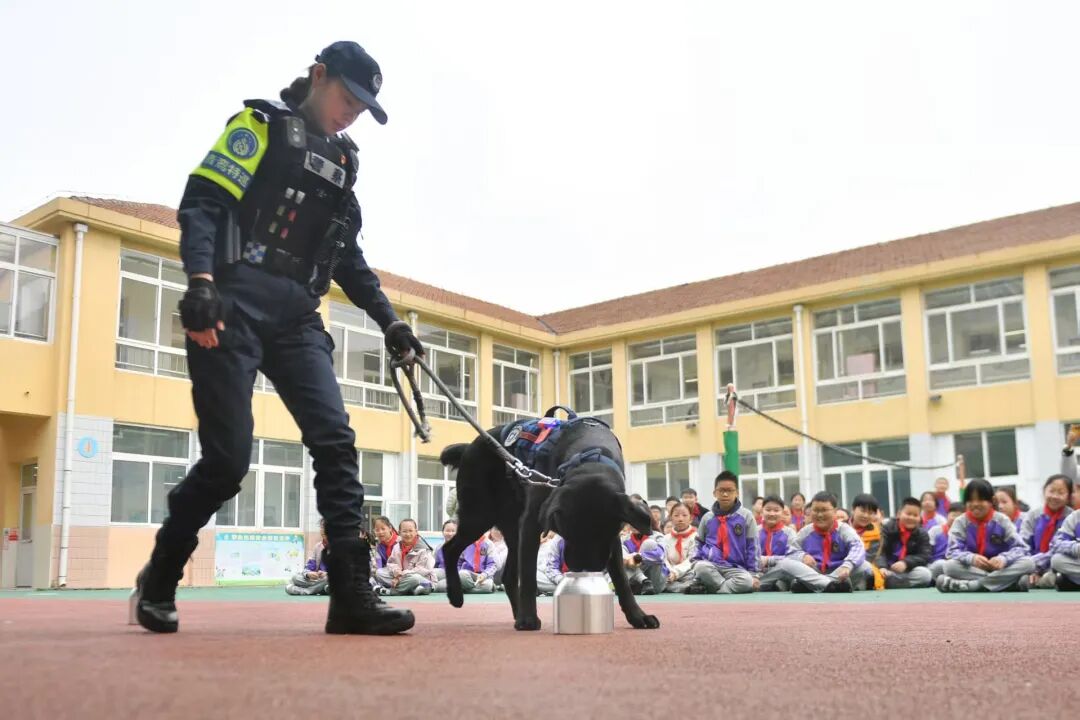 在安全小课堂上,队员用通俗易懂的语言讲解交通安全知识,普及反校园欺凌常识,互动问答环节气氛热烈。警犬“葫芦”惊喜亮相,趣味互动让安全教育更接地气。
