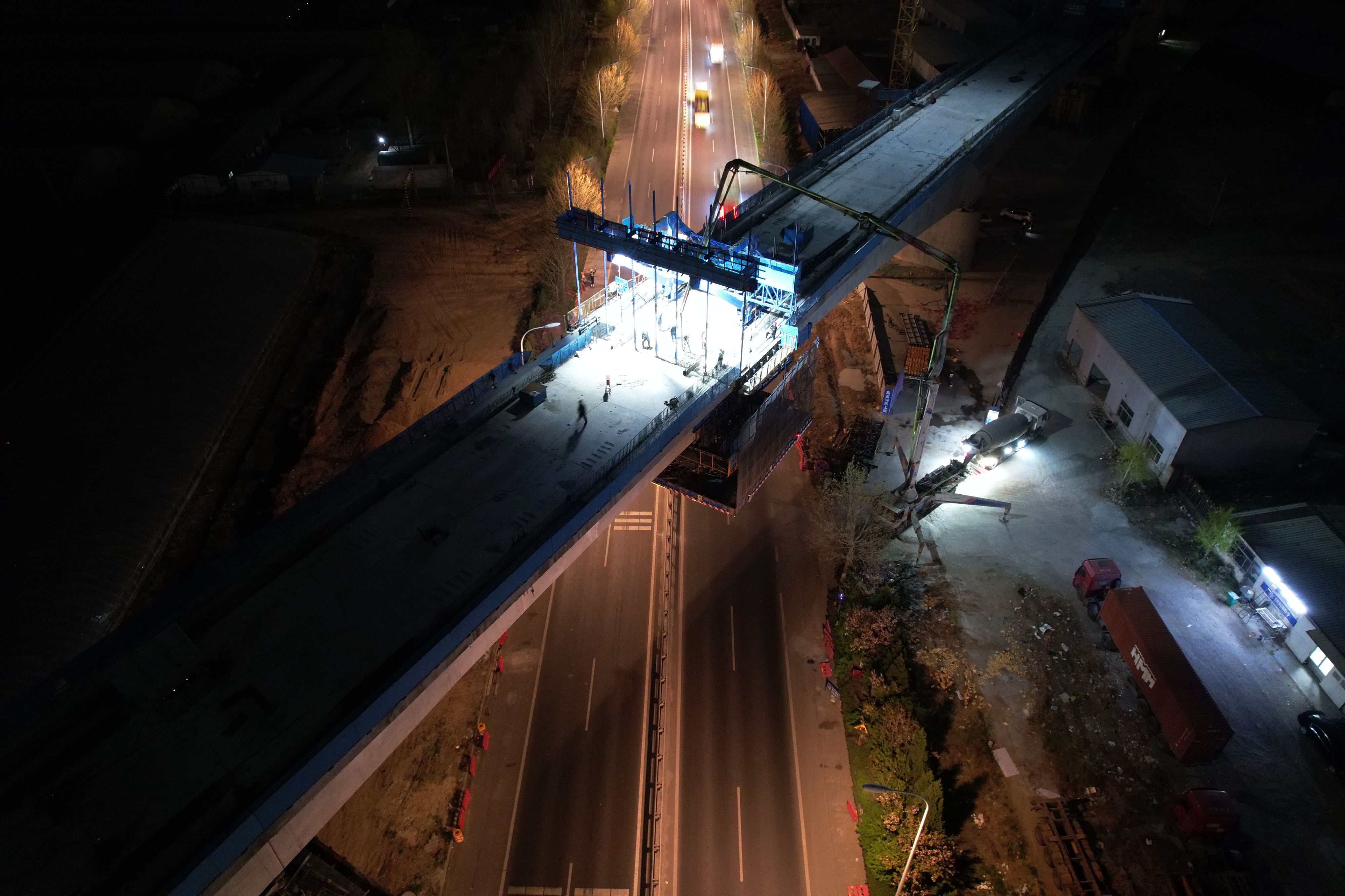 此次合龙的跨G308国道128米大跨度连续梁位于潍坊市寒亭区,是该标段重点攻坚工程。梁体施工采用挂篮悬浇施工工艺,具有跨度大、工艺复杂、线性控制精度要求高、施工周期长等特点。