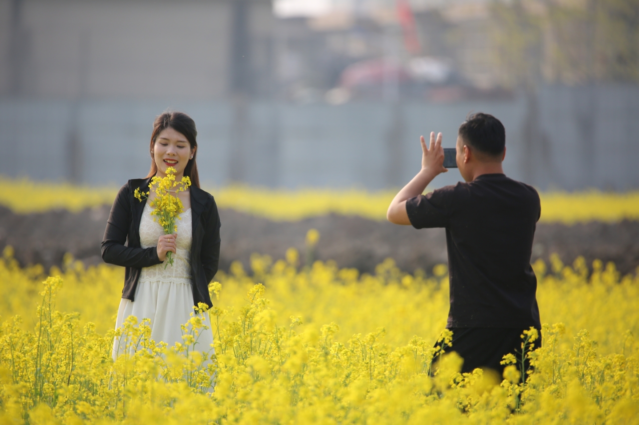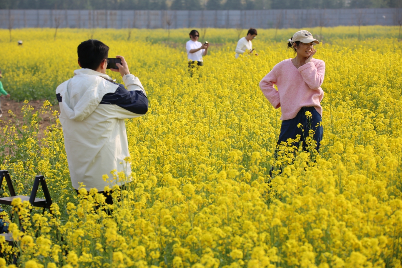 近日,临沂市兰山区枣园镇宏歌音乐公园的两百亩油菜花田进入盛花期,金黄的花海绵延起伏,吸引众多市民游客前来踏青赏花,成为春日里一道亮丽的风景线。(大众新闻记者王思晴通讯员张梅)