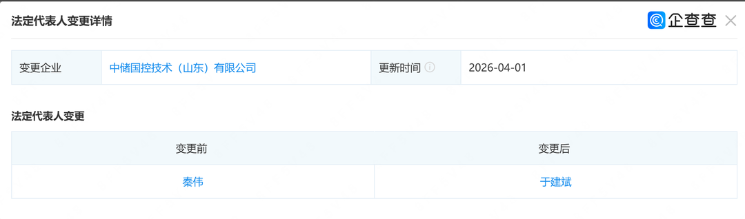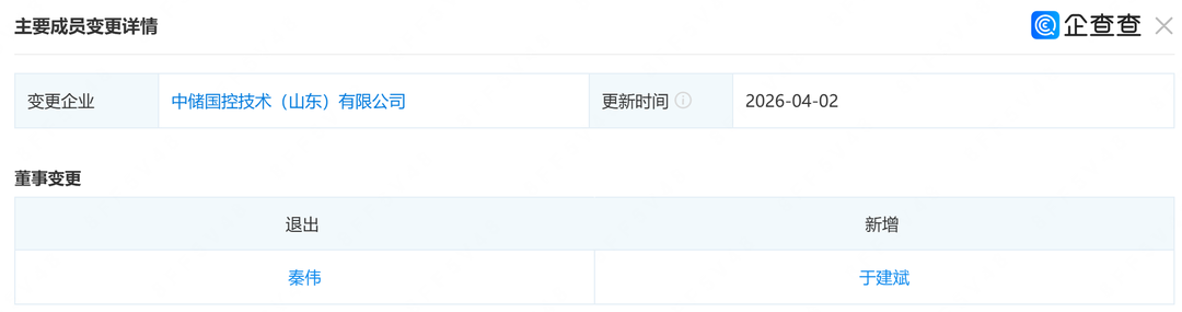企查查App显示,4月2日,中储国控技术(山东)有限公司主要成员变更,法定代表人从秦伟变更为于建斌。目前,于建斌同时担任董事一职。