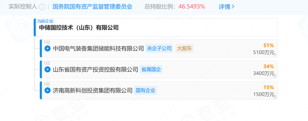 股权穿透显示,中国电气装备集团储能科技有限公司、山东省国有资产投资控股有限公司、济南高新科创投资集团有限公司分别持有中储国控技术(山东)有限公司51%、34%、15%股权。