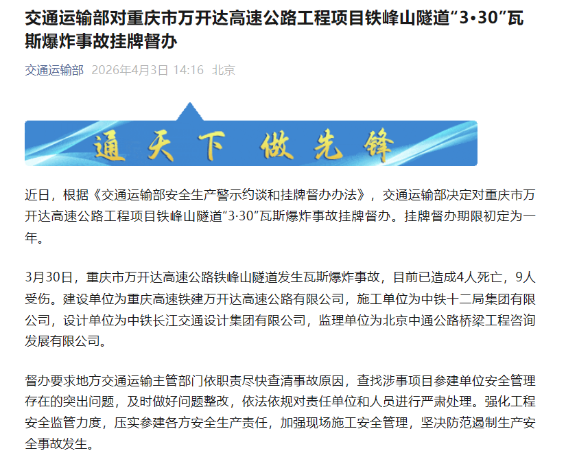 近日,根据《交通运输部安全生产警示约谈和挂牌督办办法》,交通运输部决定对重庆市万开达高速公路工程项目铁峰山隧道“3·30”瓦斯爆炸事故挂牌督办。挂牌督办期限初定为一年。