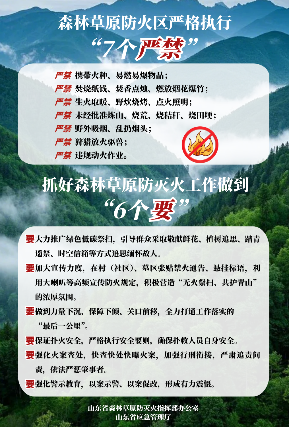 山东省森林草原防灭火指挥部办公室要求各市高度重视火险形势变化,按国家预警要求严格落实响应措施,有效应对当前严峻的高森林火险形势。要持续加强野外火源管控,采取针对性措施严格管理各类用火行为。加强火情监测,确保火情早发现。强化应急准备,确保队伍、物资到位,随时应对突发火情。严格执行24小时值班和领导带班制度,坚决杜绝迟报、漏报、瞒报。