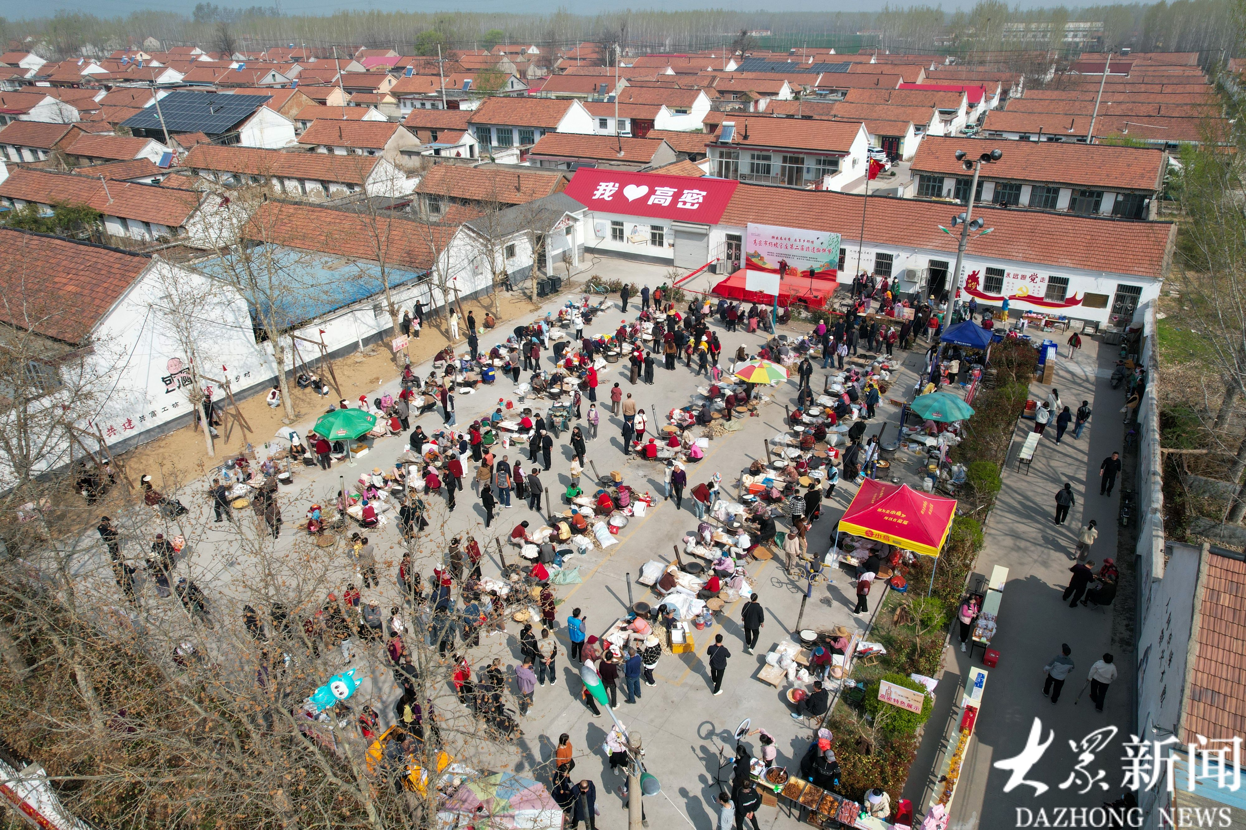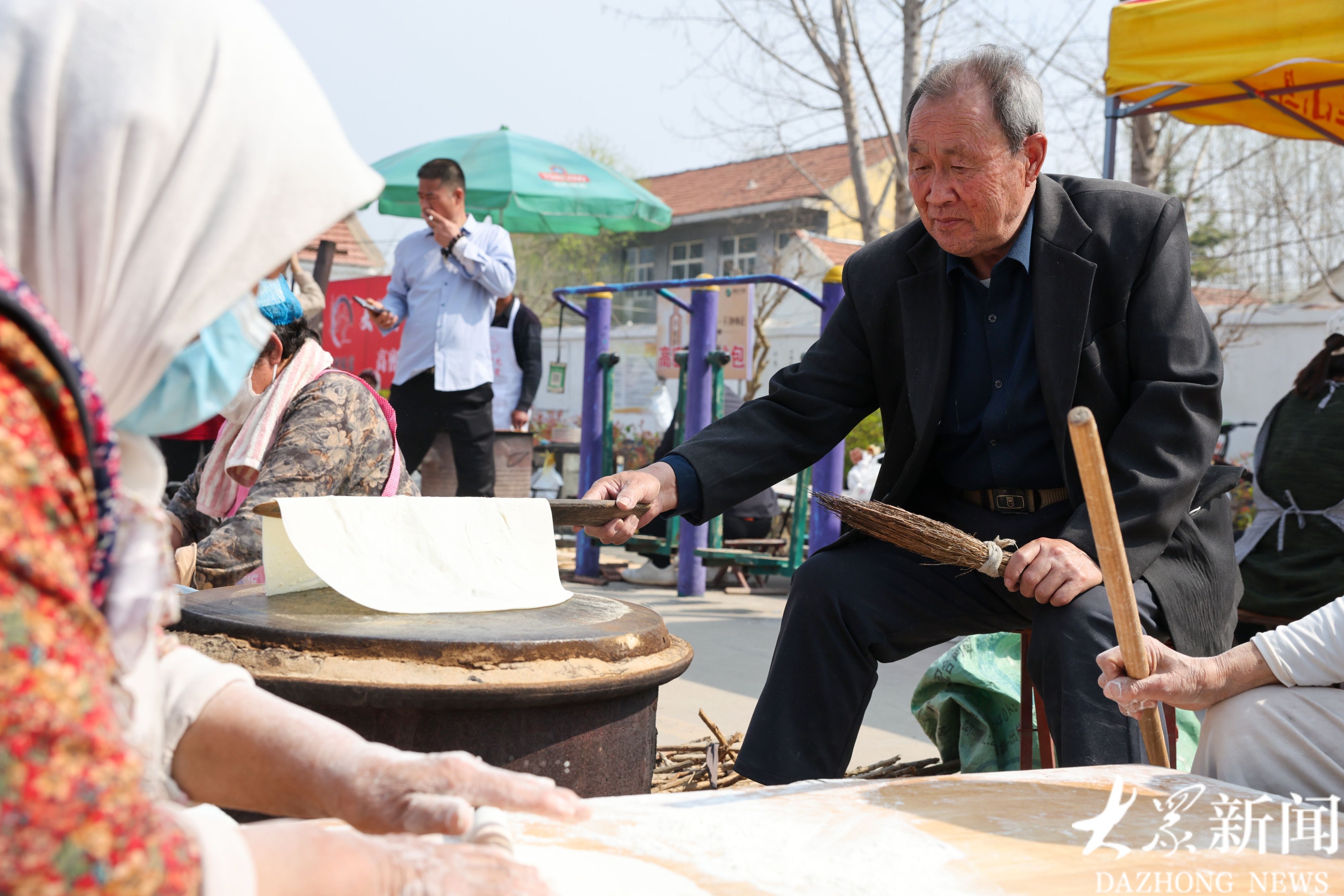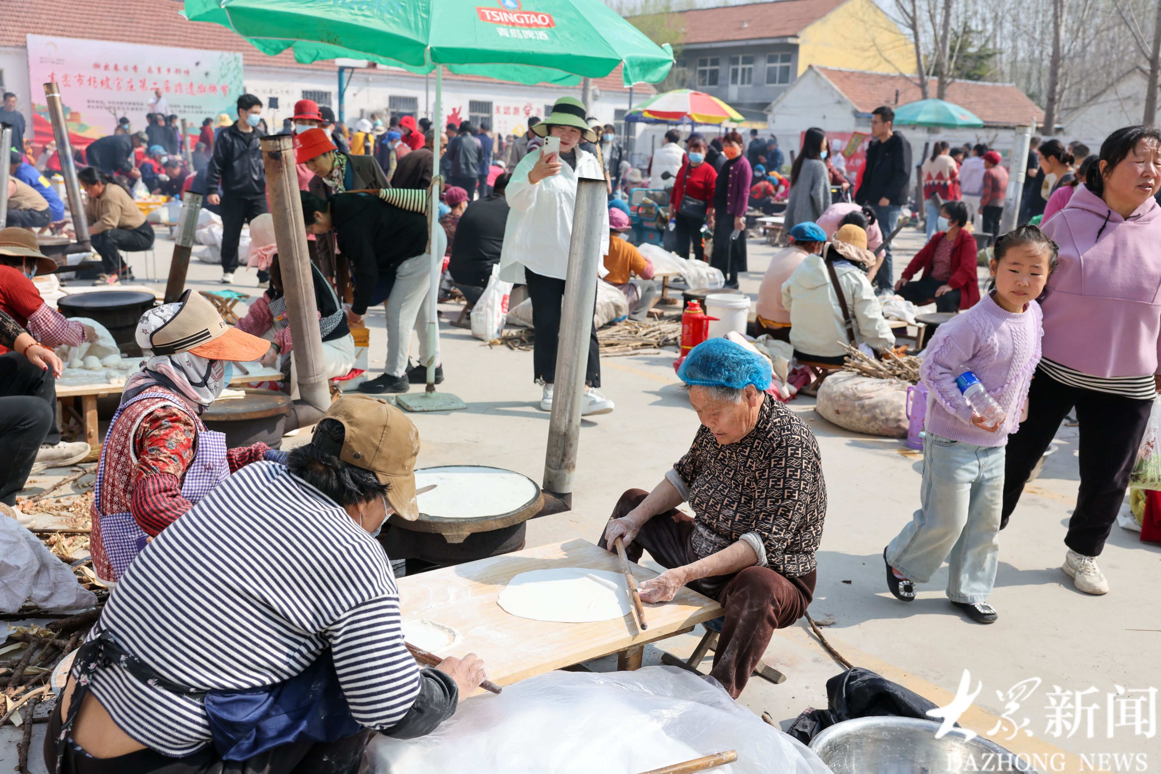 4月3日上午,高密市阚家镇杨坡官庄村广场上热闹非凡,四十个鏊子整齐分列,一百余名村民齐聚一堂,同台现场擀饼,满场飘香。杨坡官庄非遗擀饼节是在清明前举行的一场烟火气息浓郁的民俗活动,今年为第二届,活动以擀饼为主题,丰富乡村生活,助力乡村文旅。