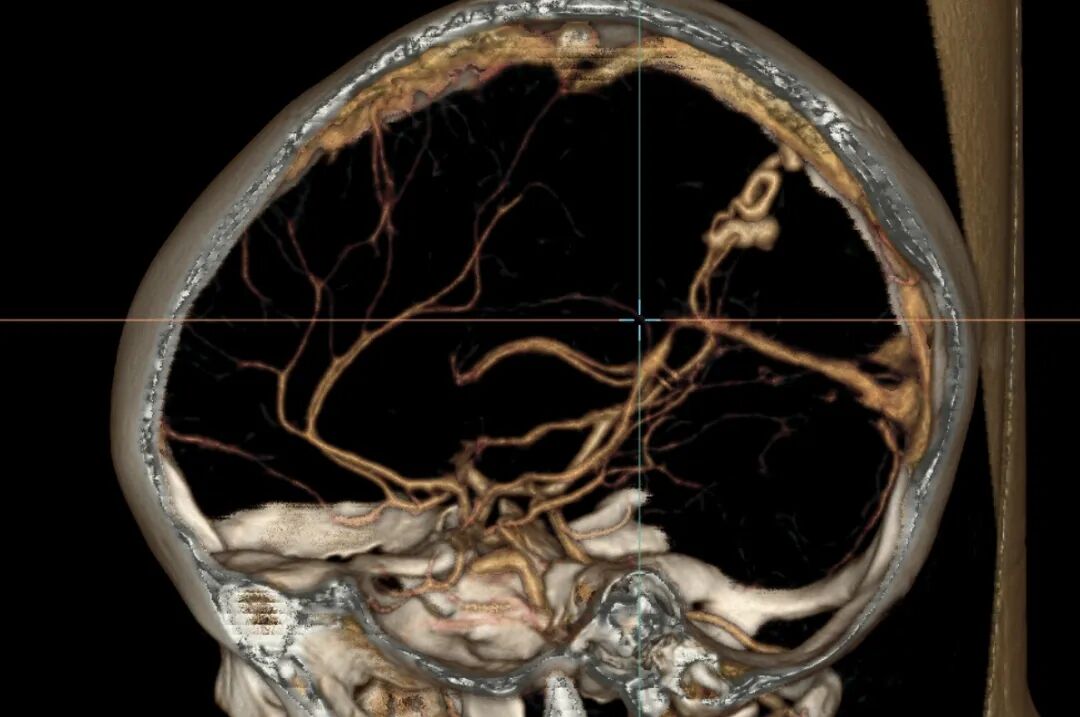 为明确诊断,紧急为婷婷安排了颅脑CTA(CT血管造影)检查,结果显示,婷婷右侧大脑后动脉供血的脑动静脉瘘合并动脉瘤,且动脉瘤已破裂出血,这正是导致突发昏迷和偏瘫的 “元凶”。这是一个极其罕见的脑血管畸形:脑动静脉瘘合并血流相关性动脉瘤,且动脉瘤已经破裂,脑动静脉瘘与动脉瘤并存更是增加了救治难度:瘘口导致血液异常分流,动脉瘤随时可能再次破裂,而60ml 的血肿已压迫脑组织,每延迟一分钟,神经功能损伤的风险就增加一分。面对如此复杂的病情,手术难度极高。