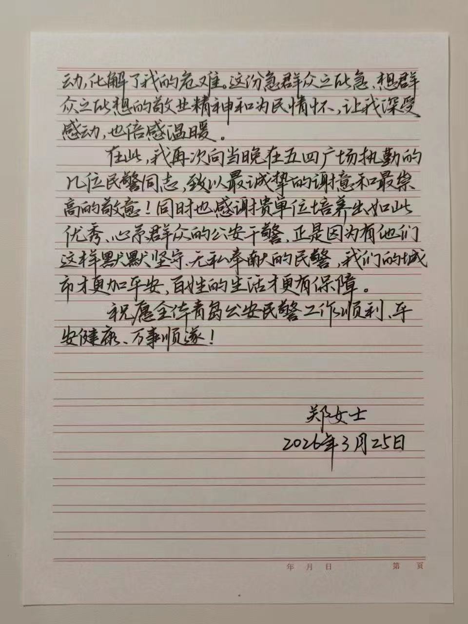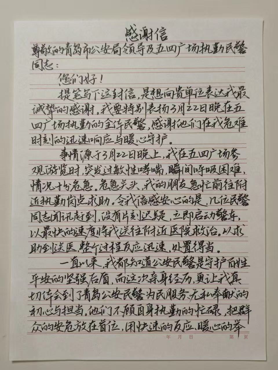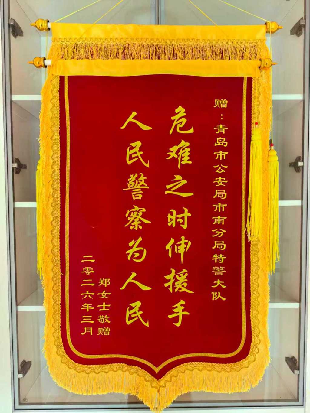 “危难之时伸援手,人民警察为人民”,一面从北京丰台寄来的鲜红锦旗,承载着游客郑女士的满满谢意,于3月30日送到市南特警大队手中,背后是一段发生在五四广场的暖心救援故事。