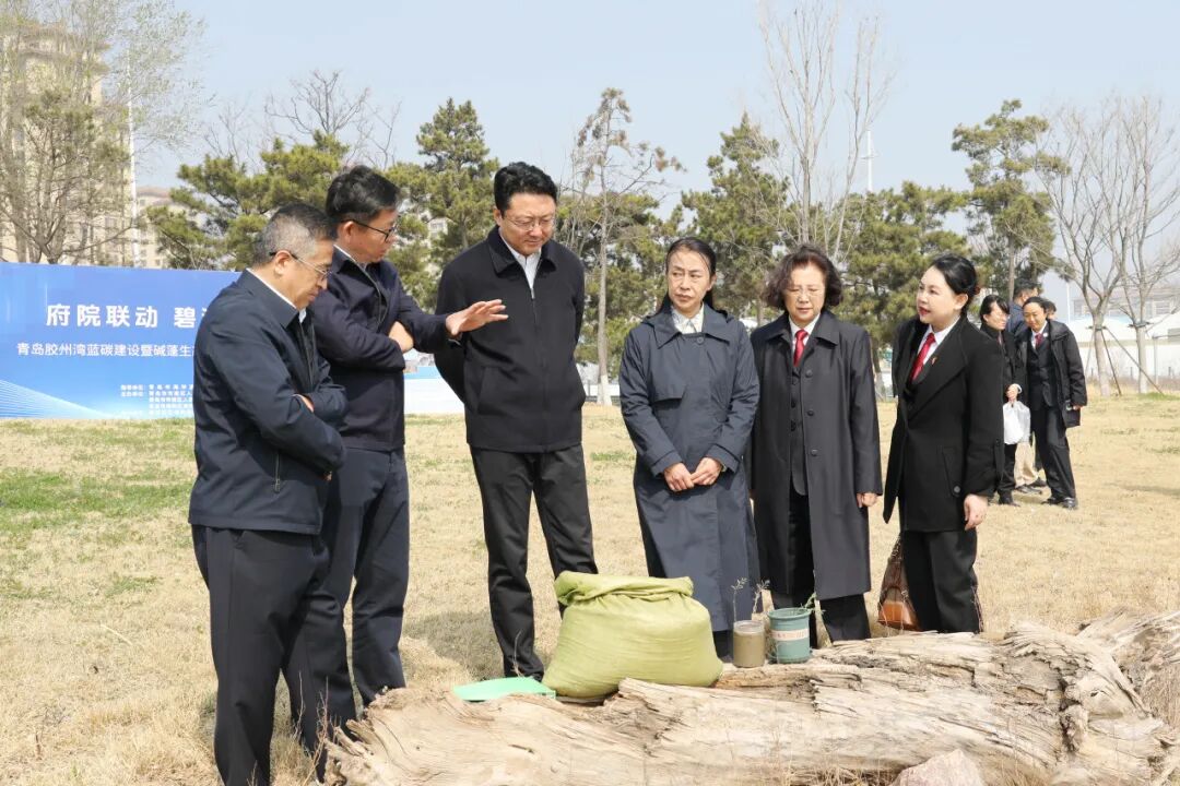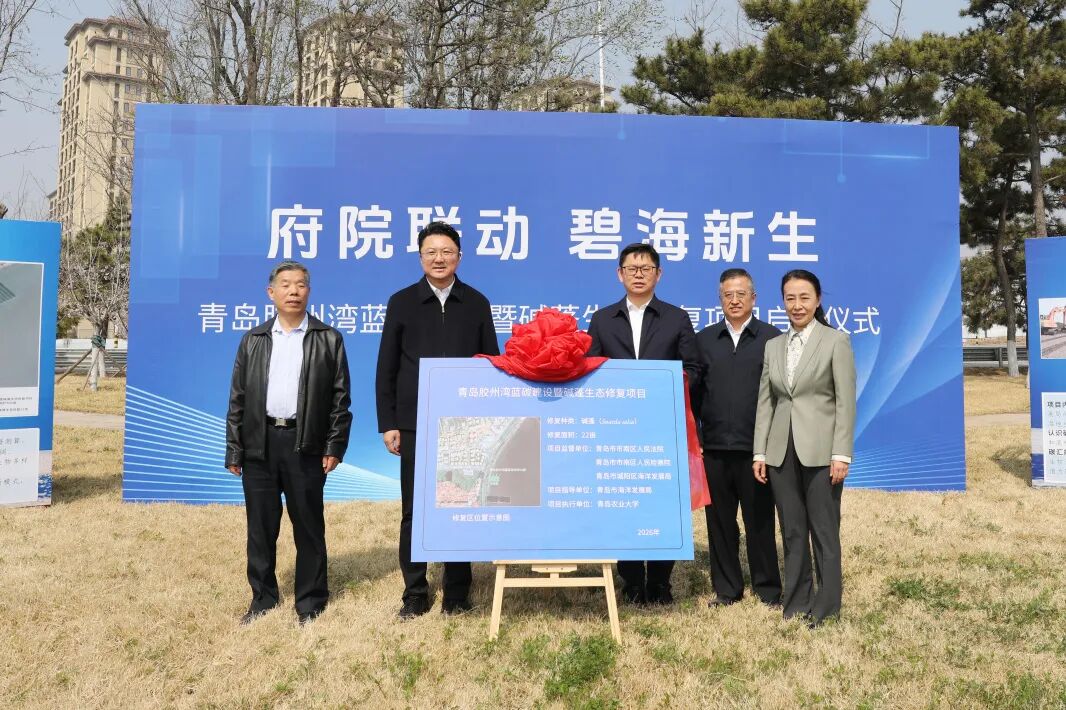 启动仪式上,城阳区政府副区长王成君,市南区法院党组书记、院长肖政,市南区检察院党组书记、检察长于仲君,青岛市海洋发展局一级调研员王子江,青岛农业大学副校长孙庆杰,共同为“青岛胶州湾蓝碳建设暨碱蓬生态修复项目”揭牌。