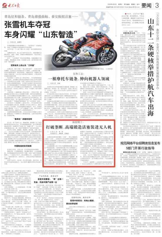 4月3日,3版要闻刊发《打破垄断,高端锻造活塞装进无人机》,报道来自宁阳的振挺精工企业制造的活塞装进了张雪机车。详情请点击这里——