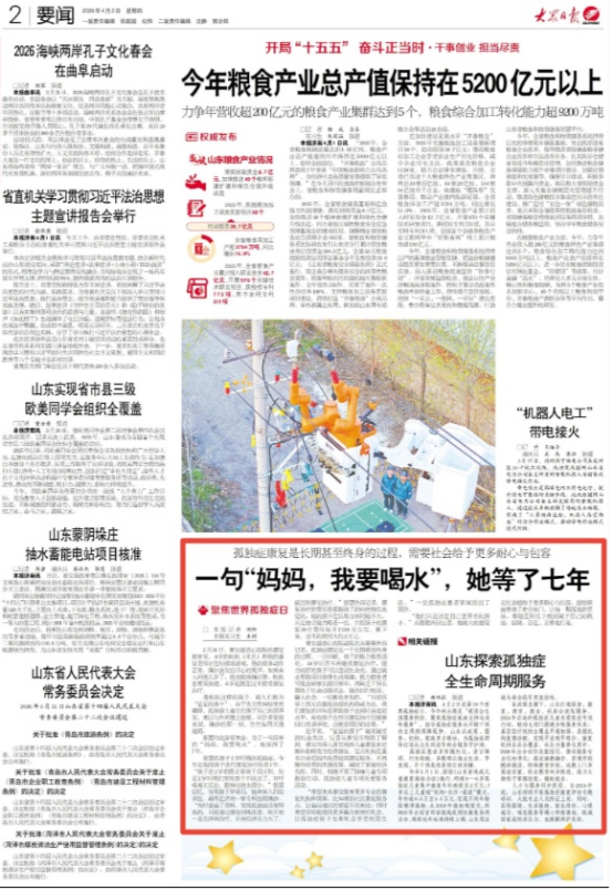 4月2日,2版要闻刊发《一句“妈妈,我要喝水”,她等了七年》,报道泰安市关爱残疾儿童,将残疾儿童康复由定额补助转变为免费康复,减轻了家庭经济负担。详情请点击这里——