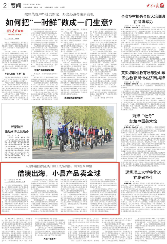 3月30日,2版要闻刊发《借澳出海,小县产品卖全球》,报道宁阳县依托广东南粤集团的平台优势,助力企业实现国际国内市场双向突破。详情请点击这里——