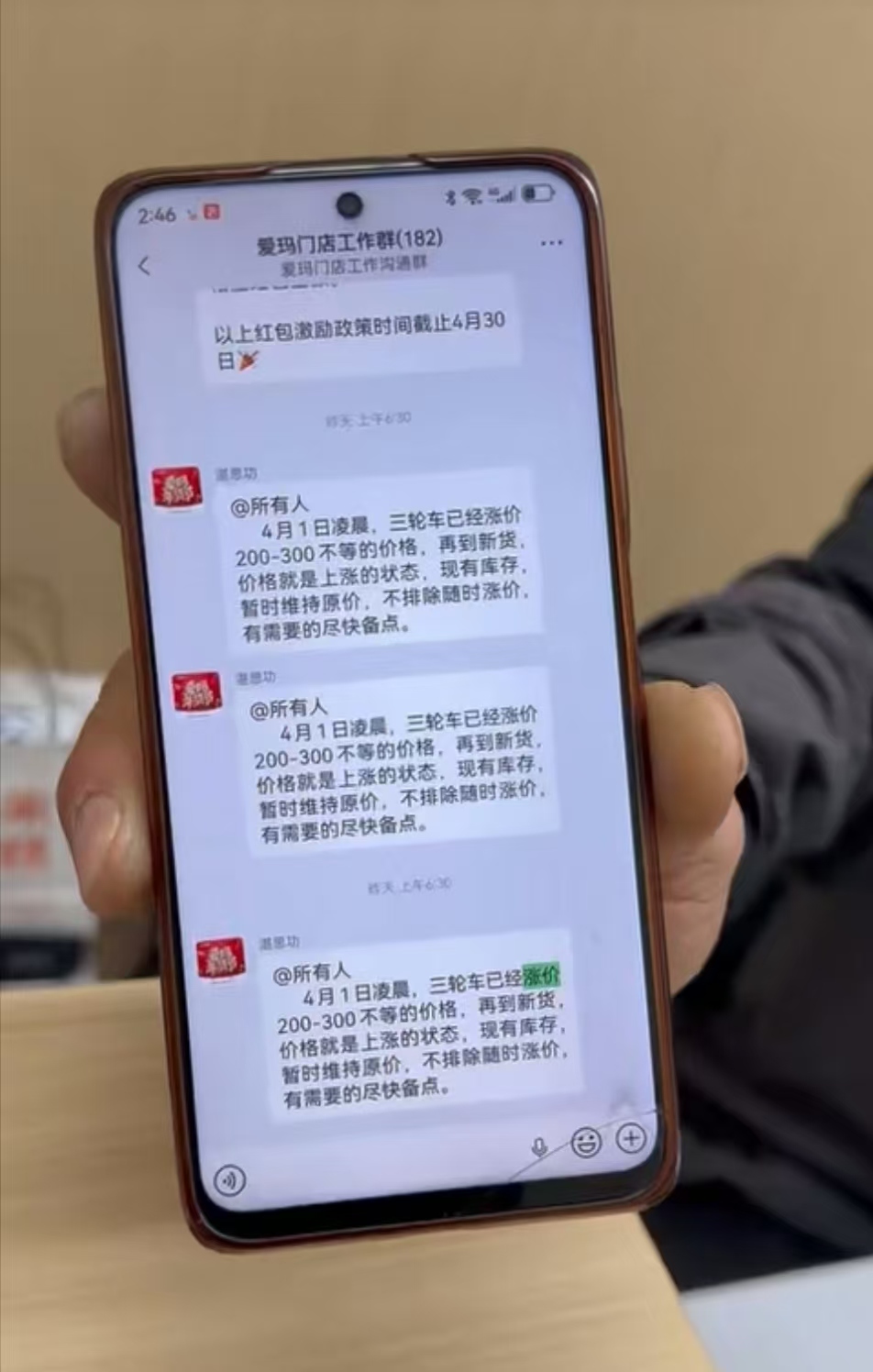 历下区一家爱玛门店也已接到将要涨价通知,但目前门店价格还没调整,价格表还没变。该店销售人员直言,“没有网上说的那么夸张,这可能是一些厂商的促销手段吧。涨百元左右是正常现象,也不是全系列都涨。不久前刚调过价,再涨消费者不买单了。”他向记者展示了群内的通知,“4月1日凌晨,三轮车已经涨价200-300不等的价格,再到新货,价格就是上涨的状态,现有库存,暂时维持原价,不排除随时涨价,有需要的尽快备点。”