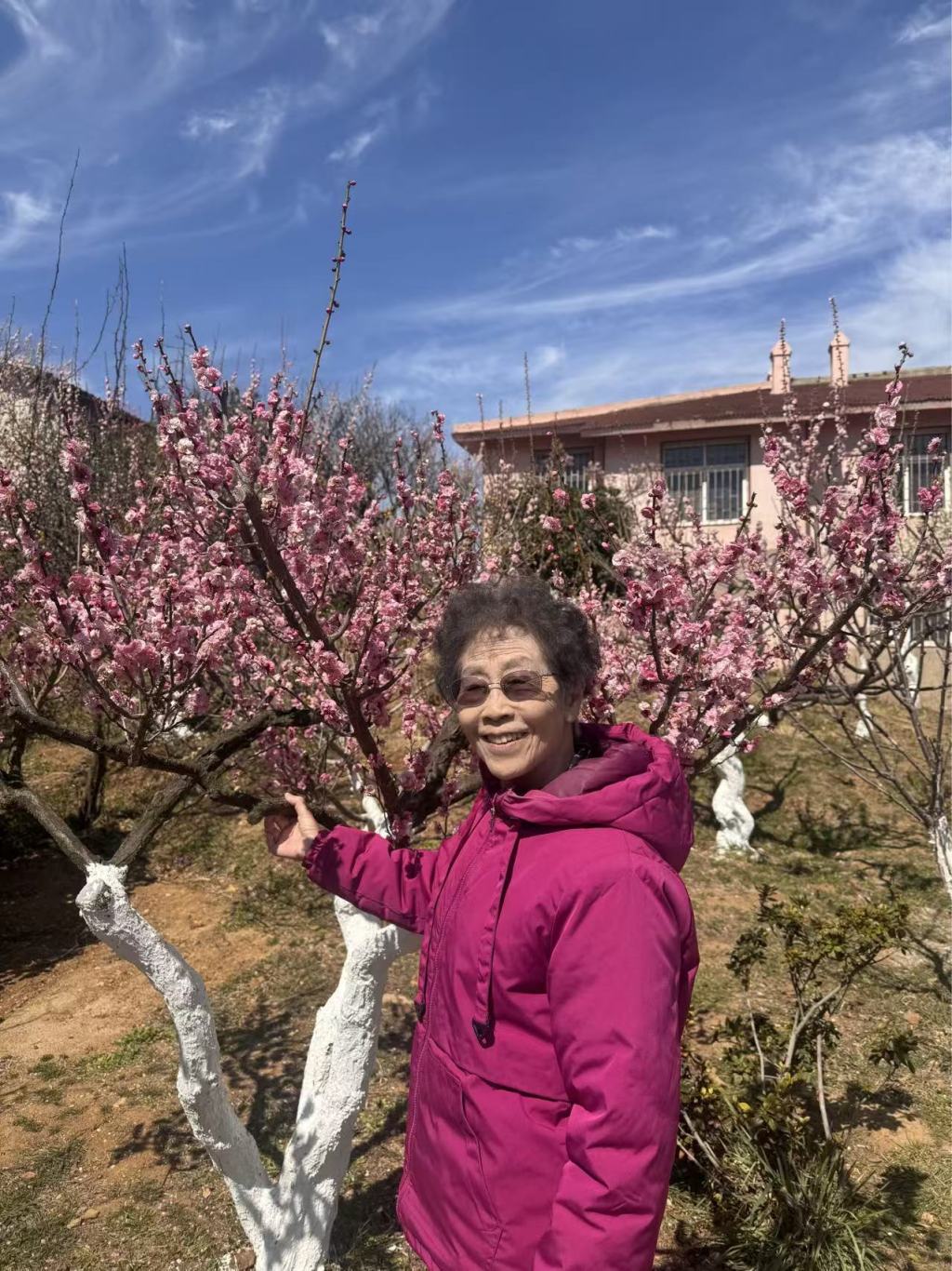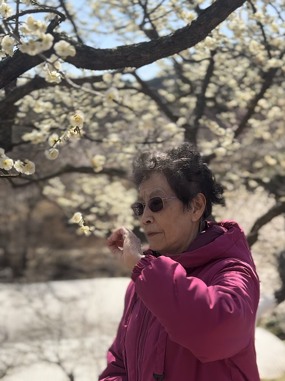 张淑珍站在梅花树下