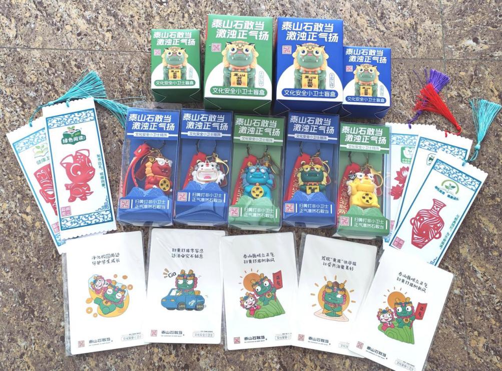以“敢”破局,在传播载体上创意融合。传统非遗要走近群众,关键在于创新表达。街道突破单一宣传模式,联合本土设计团队,对“泰山石敢当”进行IP化、萌趣化改造,推出“文化安全小卫士”系列文创产品。产品融入盲盒、钥匙链、书签、明信片、帆布包、冰箱贴等十余种群众喜闻乐见的日常载体,其中盲盒系列特别设计多款造型及隐藏款,进一步提升产品趣味性与传播力。每款产品均配套定制化故事卡片与专属二维码,故事卡片以简短生动的漫画讲述石敢当扶正祛邪的传说,并将识别盗版图书、辨别不良网络信息、拒绝有害出版物等“扫黄打非”要点融入其中;扫码即可进入街道专属知识小程序,解锁非遗故事拓展阅读、知识题库、线上答题等互动内容。通过非遗IP与治理宣传的创意融合,让群众在收集与分享中潜移默化接受文化安全教育,真正实现“以文化人、以文润心”。