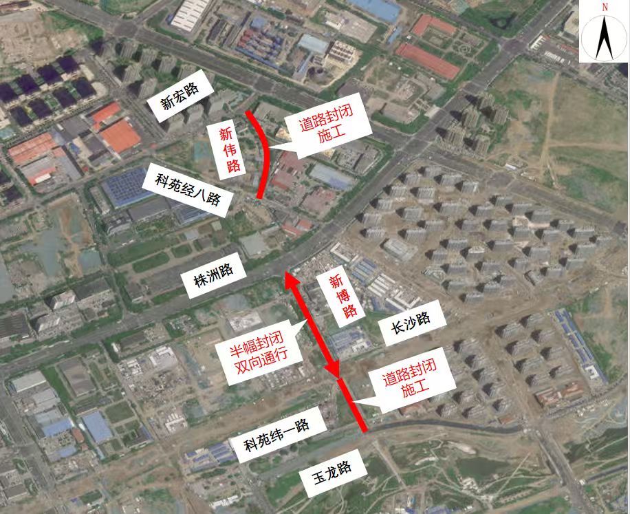 施工期间,新博路(株洲路-长沙路)段半幅封闭施工,双向通行,新博路(长沙路-玉龙路)段全封闭施工,过往车辆可通过长沙路、株洲路、蜀山路、雄安路绕行;新伟路全封闭施工,过往车辆可通过周边新宏路、枣山东路、科苑经八路、株洲路绕行。