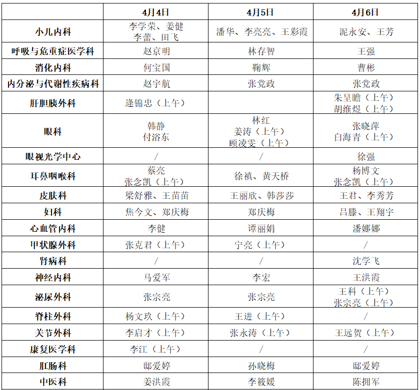 【康复科】康复门诊:4月6日全天开诊,4月4日、5日停诊;康复中医门诊:4月4日、5日、6日全天开诊。
