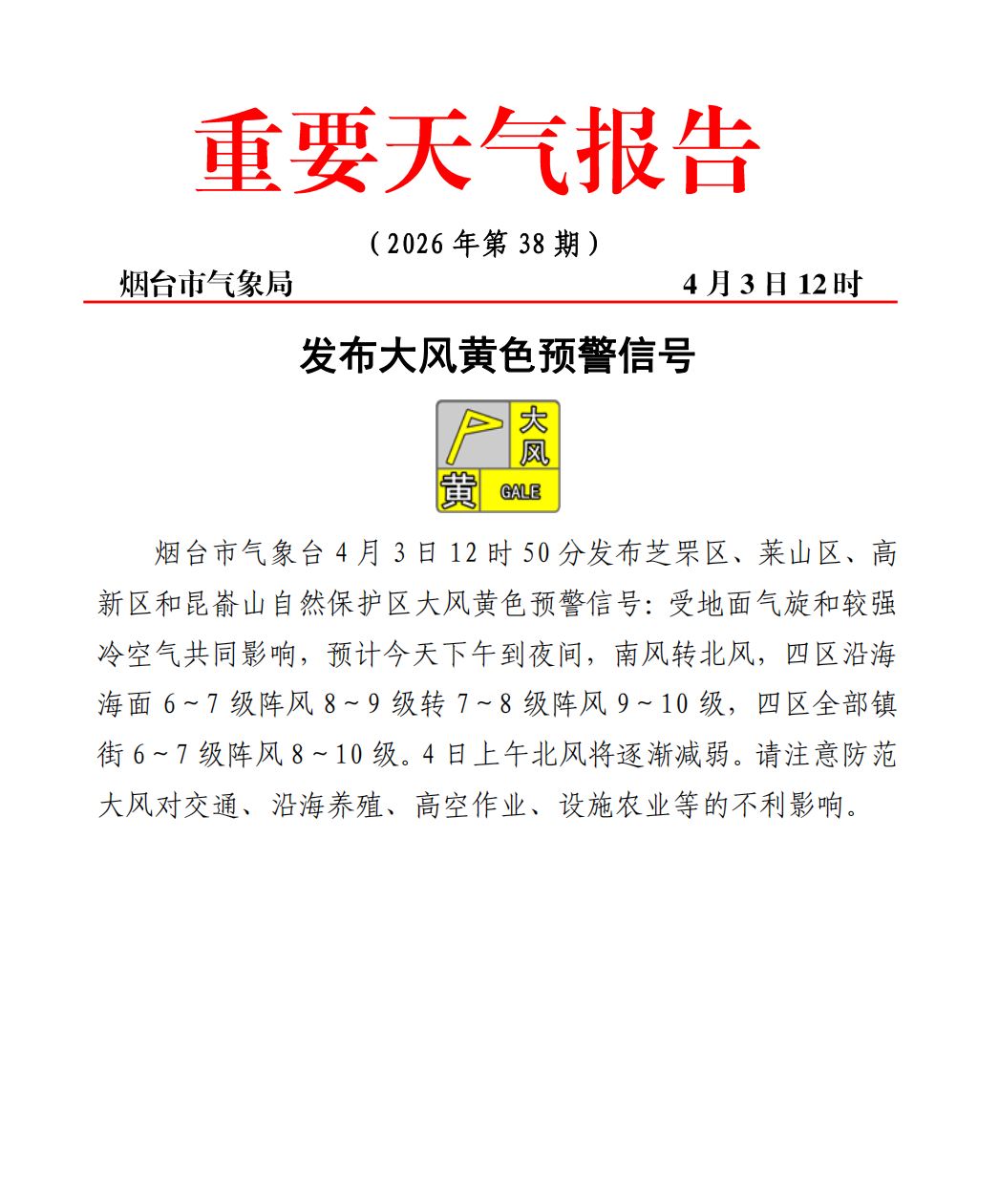 烟台市气象台4月3日发布芝罘区、莱山区、高新区和昆嵛山自然保护区大风黄色预警信号受地面气旋和较强冷空气共同影响,预计今天下午到夜间,南风转北风,四区沿海海面6~7级阵风8~9级转7~8级阵风9~10级,四区全部镇街6~7级阵风8~10级。4日上午北风将逐渐减弱。请注意防范大风对交通、沿海养殖、高空作业、设施农业等的不利影响。