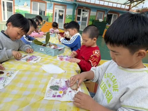 中班宝贝开启多元清明体验,传统蹴鞠游戏里,小小球员们精神抖擞,追逐着,奔跑着,虽然动作稚嫩,却个个专注认真,在奔跑嬉戏中孩子们了解古代蹴鞠运动,感受传统体育游戏的活力,既锻炼了身体,也体会到团队协作的快乐。清明节手势舞《清明谣》灵动优美,宝贝们以小手演绎节日诗意。还有植物拓印,灵巧的小手,精心挑选的花花草草,铺平、敲击、掀开满是惊喜,独一无二的作品留住春日限定美好。