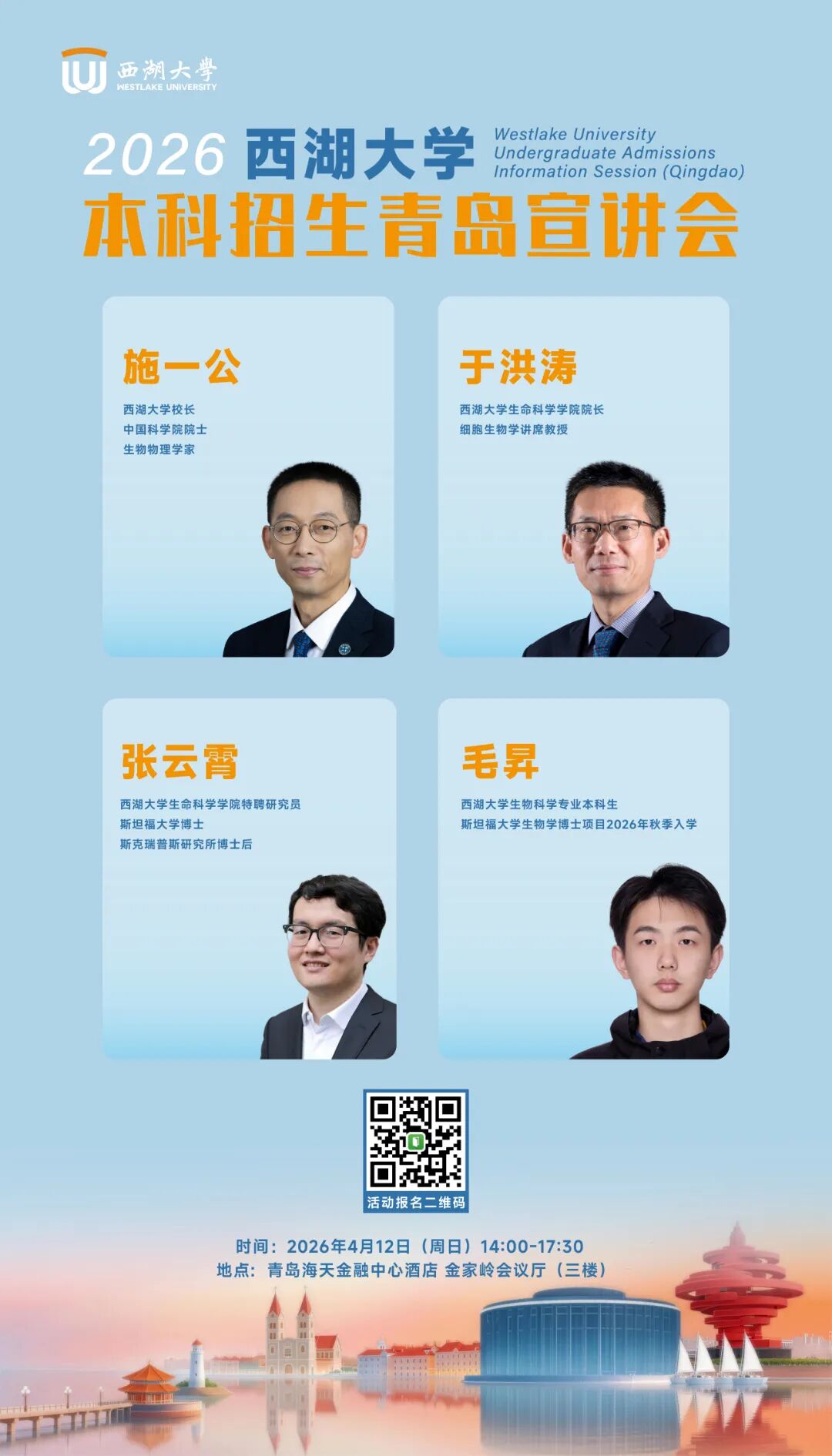 2026年西湖大学首次面向山东省开展综合评价招生。招生专业为数学与应用数学、物理学化学、材料科学与工程、电子信息工程人工智能、生物科学、临床医学六个专业。目前报名通道已正式开启。2026年4月30日前,符合条件的学生可注册报名。为了让青岛的学生和家长更好地了解西湖大学的人才培养特色,4月12日,西湖大学校长施一公将奔赴青岛举办2026年本科招生宣讲会。