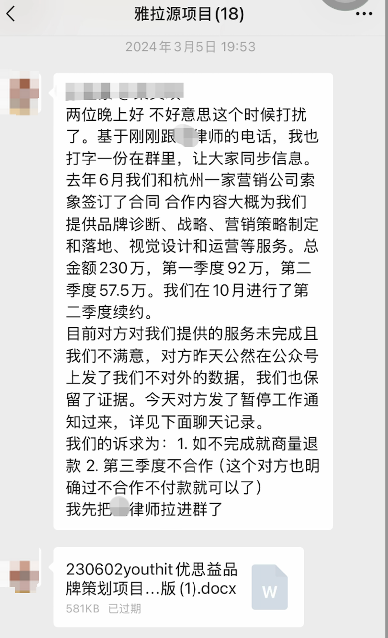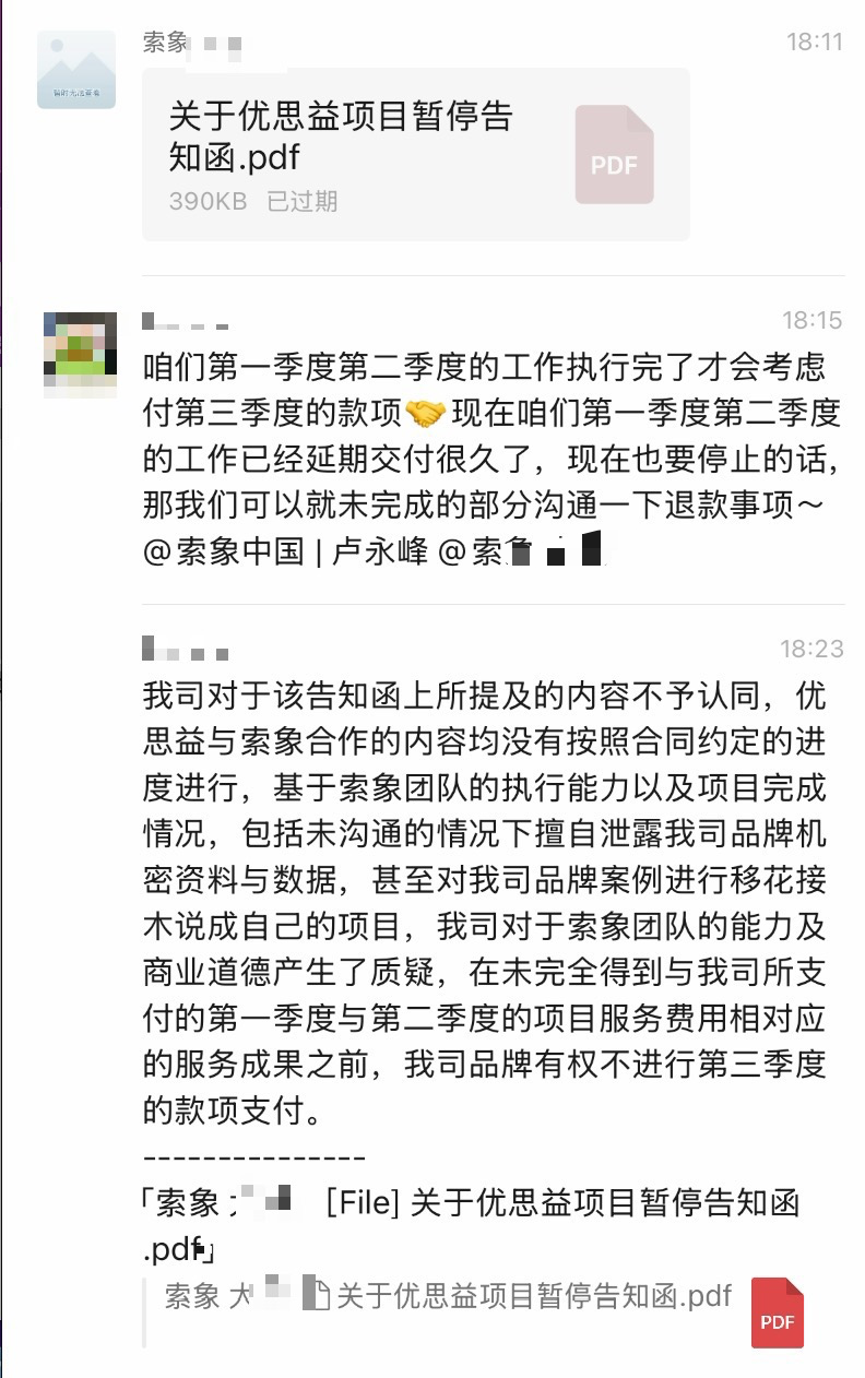 2024年3月5日,同事与对方商务提出正式要求:1. 第一二季度工作完成才考虑继续支付款项 2. 索象未履约尽职,同时在未告知背景下,违背合约泄露公司机密数据;移花接木宣称公司品牌案例是索象的项目,(与暗访报道中他们讲述的内容一致);我们要求停止合作并退款。