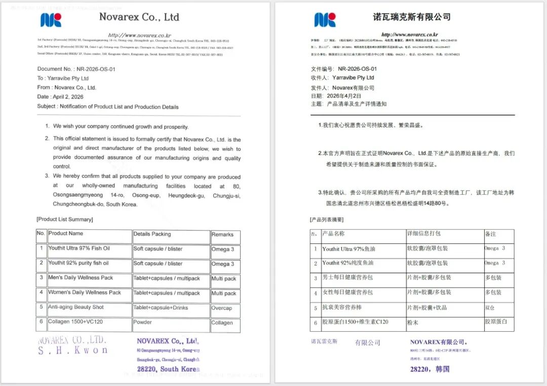 【NOVAREX CO., LTD.】80, Osongsaengmyeong 14-ro,Osong-eup,Heungdeok-gu,Chungju-si,Chungcheongbuk-do, South Korea.( 地址:韩国忠清北道忠清市兴德区五松邑五松生命14路80号)