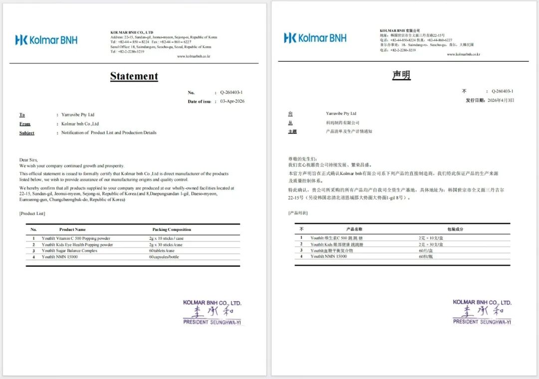 【Kolmar BNH CO., LTD】22-15, Sandan-gil, Jeonui-myeon, Sejong-si, Republic of Korea(地址:韩国世宗市全义面山丹街22-15号)