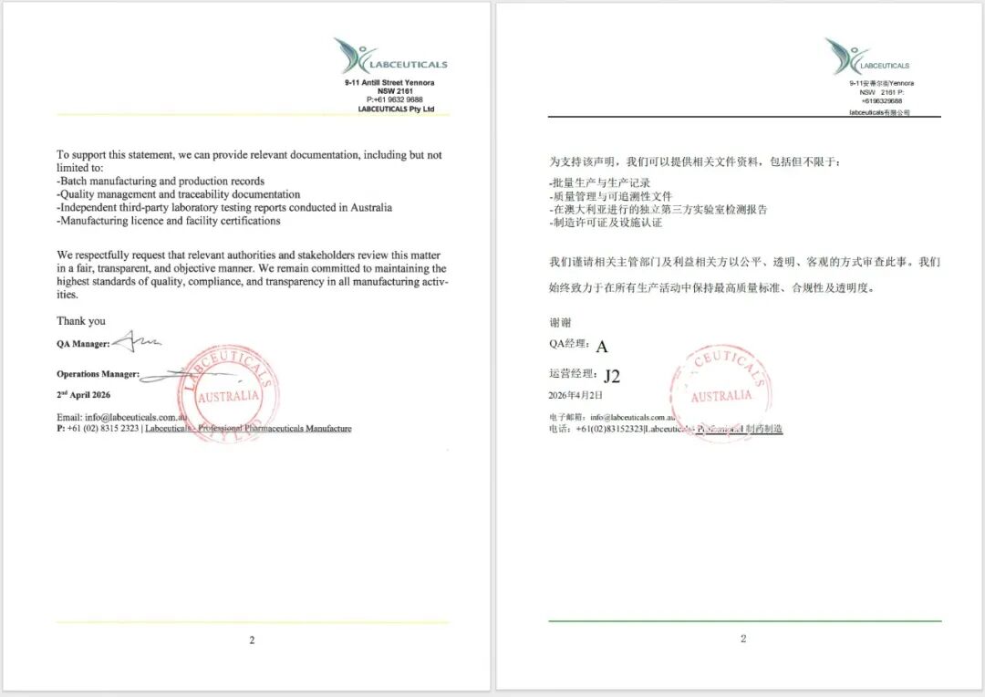 【LABCEUTICALS PTY LTD】 9-11 Antill Street, Yennora NSW 2161 Australia TGA License: MI-2016-L/-11619-1
