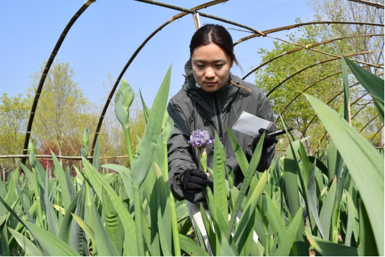 在直播镜头里面,高冉仍然在卖力介绍产品,而工人宋慈也悄然闯进了镜头。“在我背后,我们的工人正在检查花的生长情况,给每株花做标记。”高冉介绍。宋慈手里拿着标签,认真观察花的生长情况,随手记下花的特征,并将标签标签贴在叶子上。“目前我们种的鸢尾花是杂交后的品种,没有刻意进行授粉,花粉全靠自然传播,这就导致每株花的颜色和形态都不一样。”宋慈介绍,现在花正在陆续开,工人每天都要到花圃检查花的生长状况,看见花开了之后,就立即记下花的特征,附上标签,然后放到直播间销售。