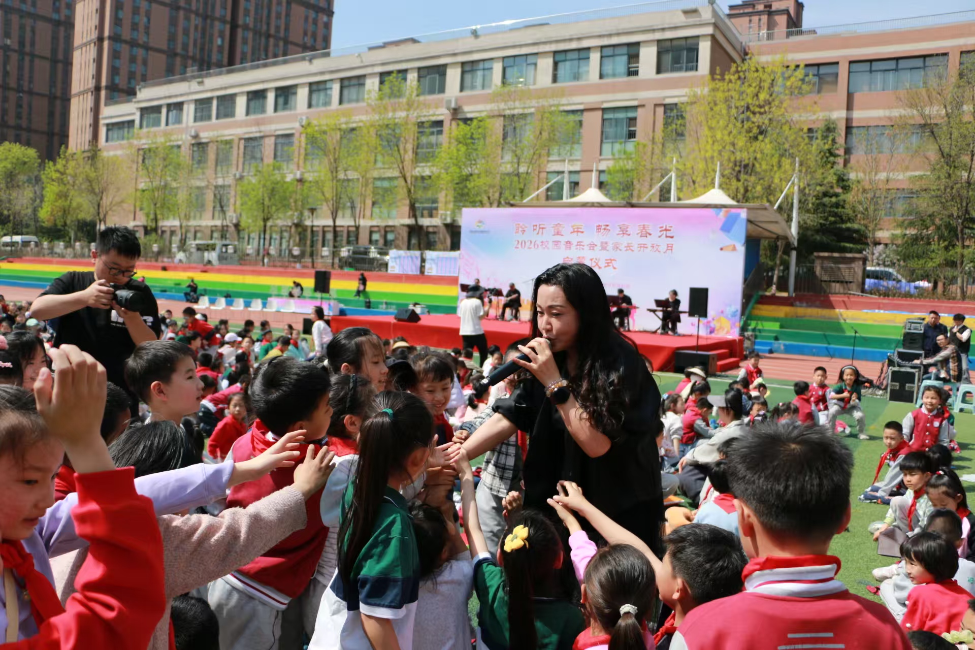 《稻香》的童真怀旧、《少年》的意气风发、《孤勇者》的坚定执着、《逆战》的热血澎湃、《星辰大海》的辽阔憧憬、《大鱼》的空灵悠远……一首首涵盖童年金曲、励志歌曲、影视动画主题曲的经典曲目轮番唱响,旋律明快悠扬,情感饱满真挚。孩子们挥舞着小手,跟着节奏轻轻跟唱,稚嫩的童声与艺术家们的精湛演绎交织,让整个校园化作一片欢乐的艺术海洋。