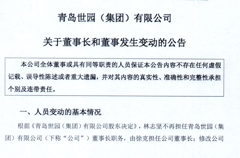 4月3日,青岛世园(集团)有限公司(下称“世园集团”)发布董事长和董事发生变动的公告。公告披露,根据《青岛世园(集团)有限公司股东决定》,林志坚不再担任公司董事长职务,由徐克接任;修改公司章程,公司董事会由三名董事组成,设董事长一名,董事两名(职工董事);免去林志坚、李鑫、孙琦、李佩亚、孙玮昌、蓝晓蕾、陈伟董事职务,新任董事会成员为徐克、刘勇、王鑫。