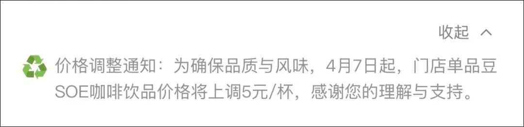 近期,Manner Coffee在其官方点单小程序发布价格调整公告,表示将从4月7日起将门店单品豆SOE咖啡,每杯价格上调5元。