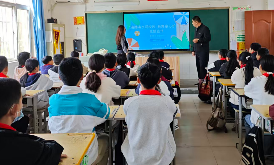 一行人首先走进阳谷县阎楼镇中心小学,宣传队员化身“节水讲师”,为孩子们开设了一堂趣味盎然的节水小课。互动问答环节更是点燃了孩子们的参与热情,大家踊跃举手、积极分享,纷纷立志做守护水资源的小小卫士。宣传队员还为孩子们送上节水宣传手册和环保文具,以小手拉大手的力量,让节水理念的小小种子在校园生根发芽。