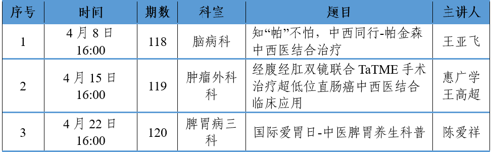 为积极响应“健康中国”号召,助力公众践行科学健康的生活方式,临沂市中医医院在高铁院区门诊楼一楼名医堂候诊区每周开设30分钟的“岐黄大讲堂”公益讲座,课后进行答疑,医学专业人员使用通俗易懂的语言讲解中西医保健知识与技能。欢迎广大市民、患者、陪护人员及医务人员参加。现拟定2026年4月岐黄大讲堂课程表,具体安排如下: