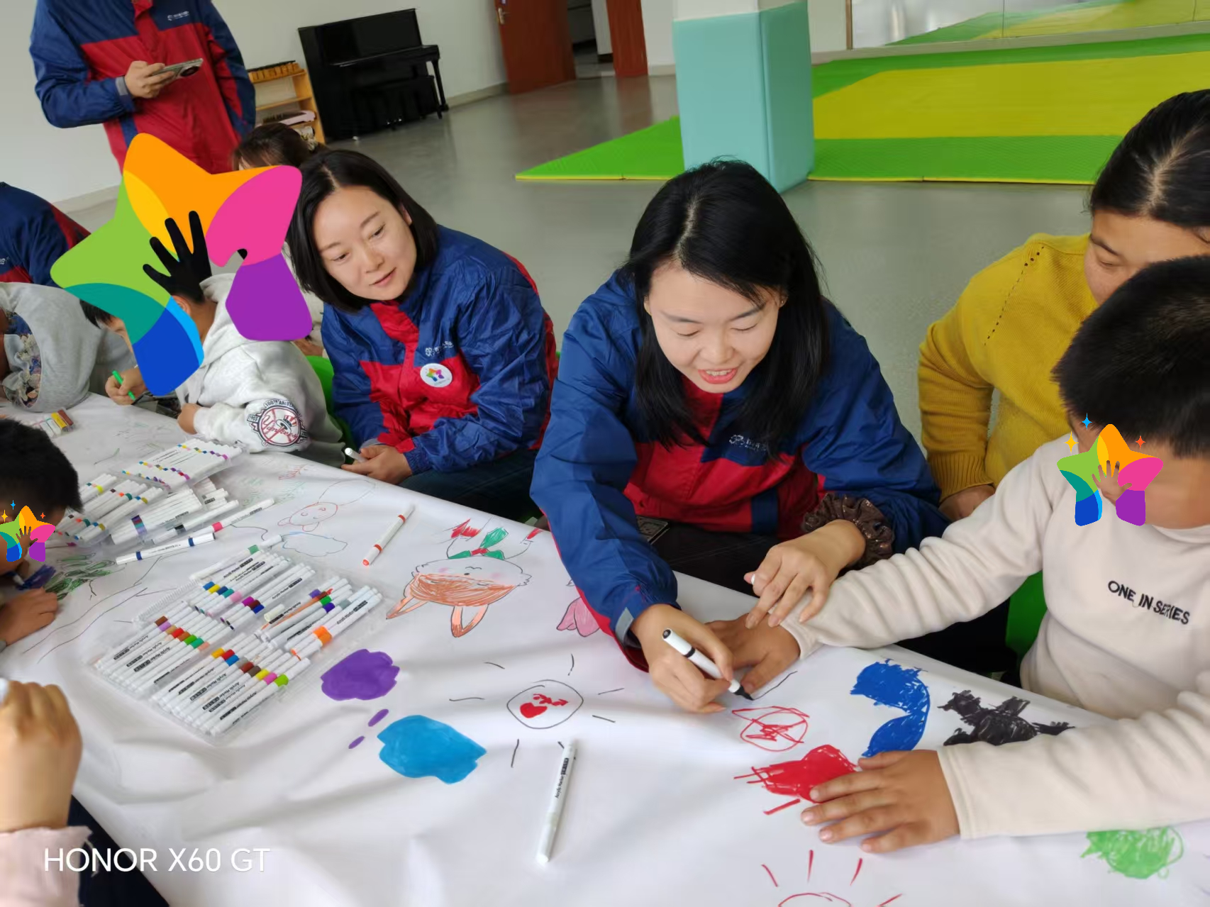 在张院长的组织带领下,志愿者与孩子们分坐课桌两侧,长长的画布铺展开来,老师们将水彩画笔分发到每个人手中。没有绘画要求,没有主题限制,“星童”和志愿者们自由自在地在画布上挥洒创意。不一会儿,五彩的图画跃然纸上:蓝色的云朵、红色的太阳、黑色的小乌龟、绿色的毛毛虫和大怪物,还有志愿者阿姨画的橘色猫咪……孩子们认真投入的样子,让老师们不忍叫停。
