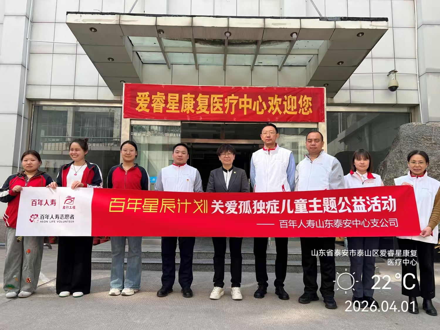 在世界孤独症关注日来临前夕,4月1日,百年人寿泰安中支一行五人走进泰安市泰山区爱睿星康复医疗中心,开展“百年星辰计划”关爱孤独症儿童主题公益活动。本次活动由公司银保渠道负责人带队,作为一名党员,他充分发挥先锋模范作用,带领志愿者们用爱心与陪伴,为“星星的孩子”送去春日里的温暖。