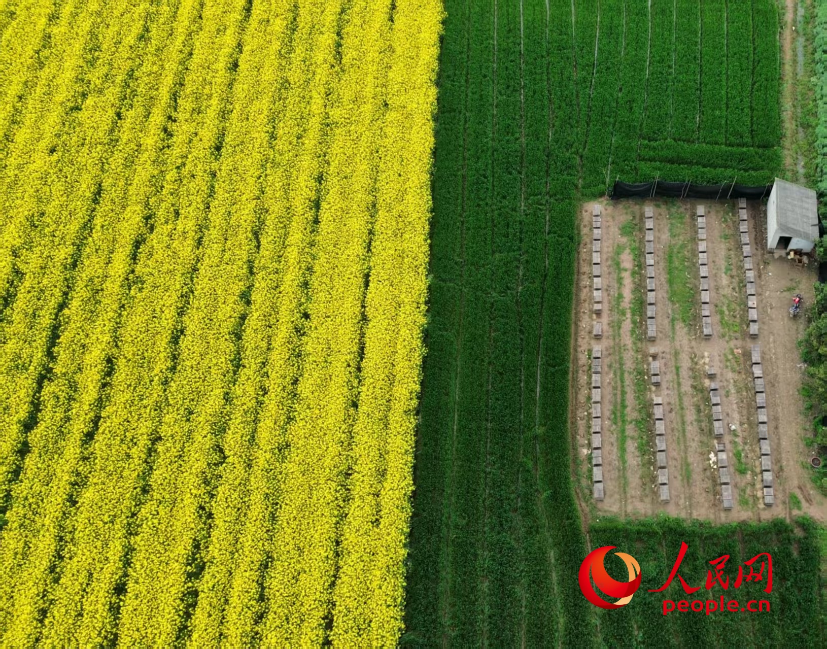 油菜花田附近的蜂场。人民网记者 黄钰摄