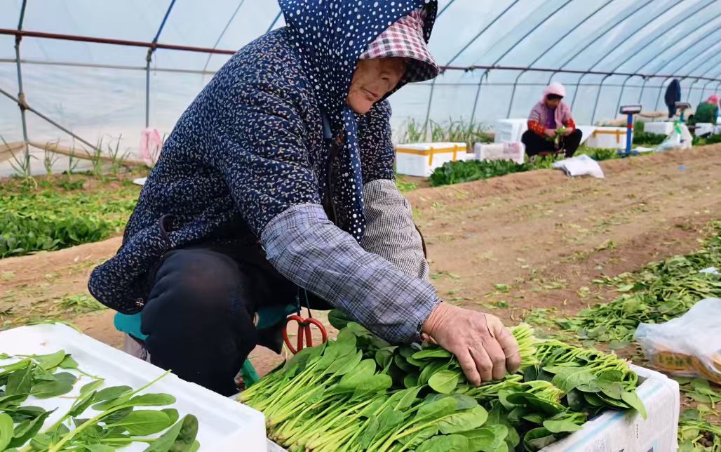 4月3日,在淄博市高青县黑里寨镇的山东昊瑞农业科技发展有限公司的大棚里,一畦畦菠菜鲜嫩喜人。农户们手脚麻利地割下菠菜,修掉老叶、捋净毛根,再把长短齐整的菠菜一棵棵码进泡沫箱,等着送到消费者的餐桌上。