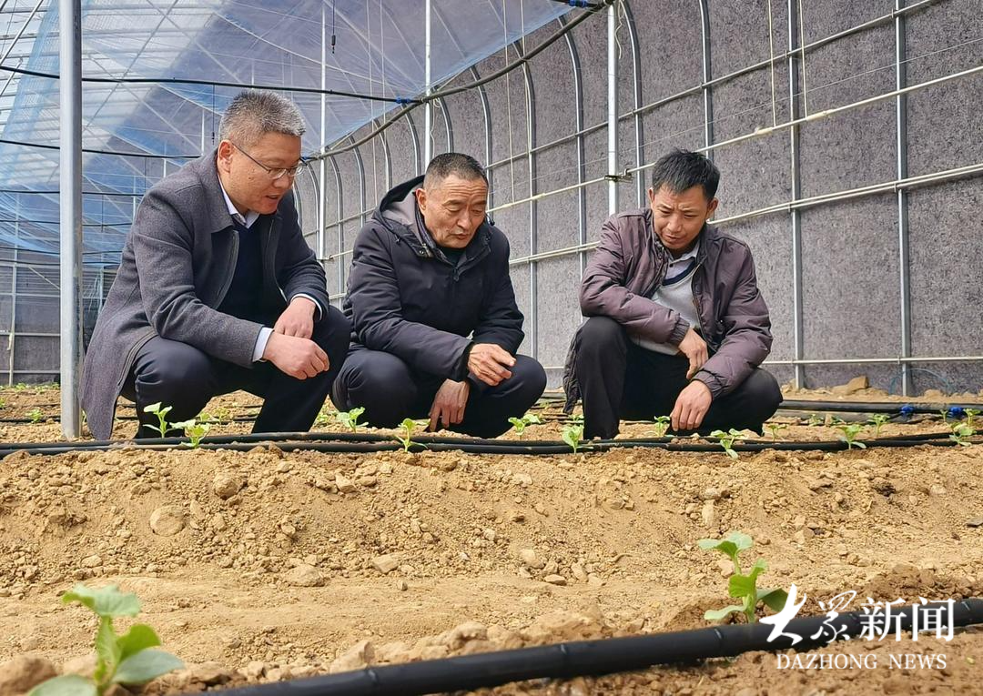 董太军与王舜平(中)、王怀水(右)察看瓜苗长势。