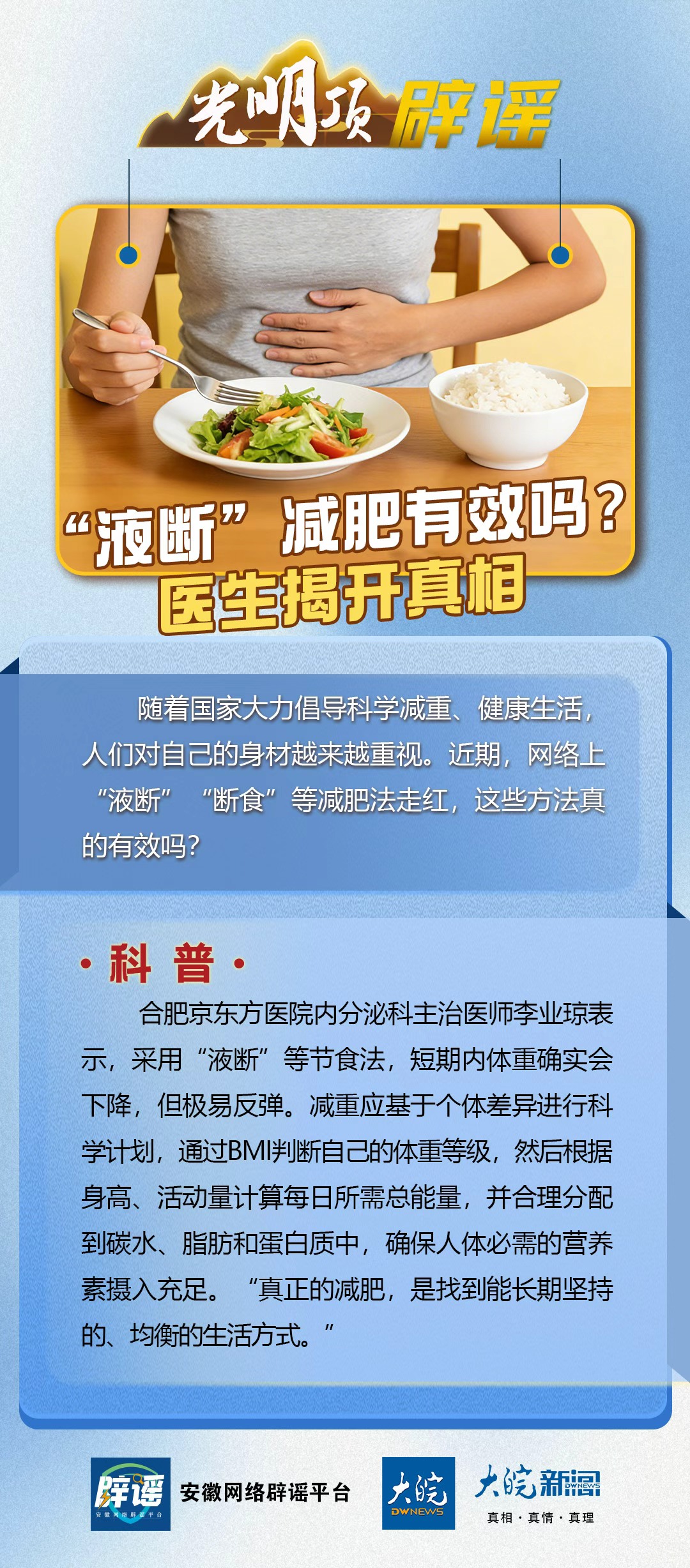 随着国家大力倡导科学减重,健康生活,人们对自己的身材越来越重视。近期,网络上“液断”“断食”等减肥法走红,这些方法真的有效吗?