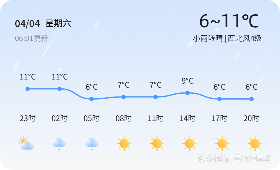 今天是4月4日,星期六,农历二月十七。威海市今日天气为小雨转晴,气温介于6℃至11℃之间,西北风4级,空气湿度为79%,PM2.5浓度为38,空气质量良好。市民朋友们出行时请注意携带雨具,雨天路滑,驾车时请减速慢行,确保行车安全。