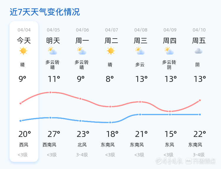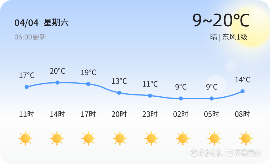 今天是4月4日,星期六,农历二月十七。枣庄市今日天气晴朗,气温介于9℃至20℃之间,东风1级,空气湿度为53%,PM2.5指数为90。各区县天气状况一致,均以晴好天气为主,适宜户外活动。