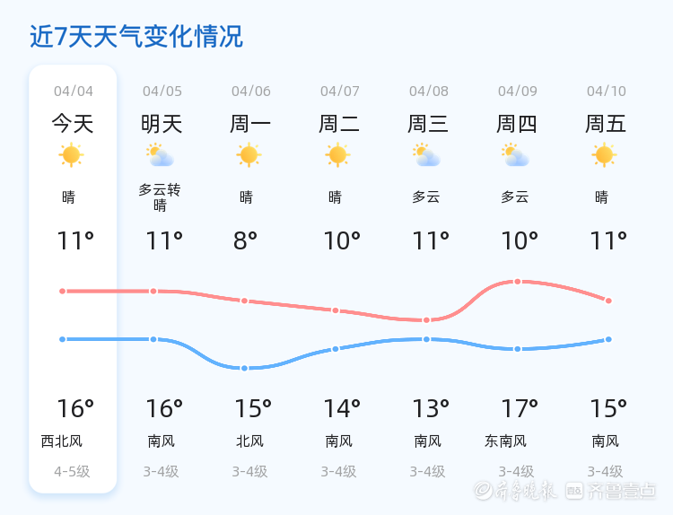 今天是4月4日,星期六,农历二月十七。青岛市迎来了一天的晴好天气,全市范围内气温适中,北风4级,空气湿度为84%,PM2.5指数为48,空气质量良好。今天的最高气温为16℃,最低气温为11℃,各区天气情况一致,均为晴朗天气,适合市民外出活动。