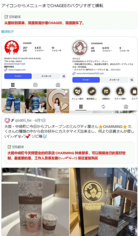 近日,有日本IP的网友发帖称,在日本大阪中崎町喝到一家新开的奶茶品牌Charming Tea Shop,有网友表示,该品牌从品牌图标、菜单到产品设计均涉嫌抄袭中国茶饮品牌霸王茶姬。有网友在社交媒体晒出对比图,认为该店图标到菜单,抄袭了CHAGEE(霸王茶姬)与霸王茶姬相似。