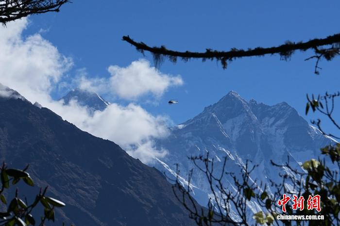 2025年5月29日,一架尼泊尔直升机在喜马拉雅山区珠穆朗玛峰与洛子峰南麓上空飞行。 中新社记者 崔楠 摄 (资料图片)