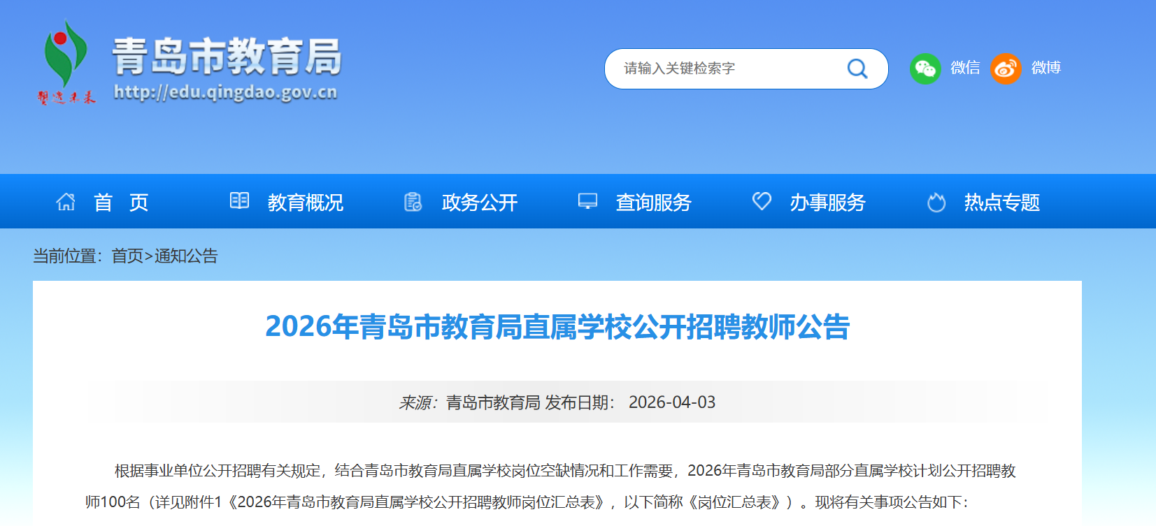 4月3日,青岛市教育局发布2026年青岛市教育局直属学校公开招聘教师公告,招聘教师100名。