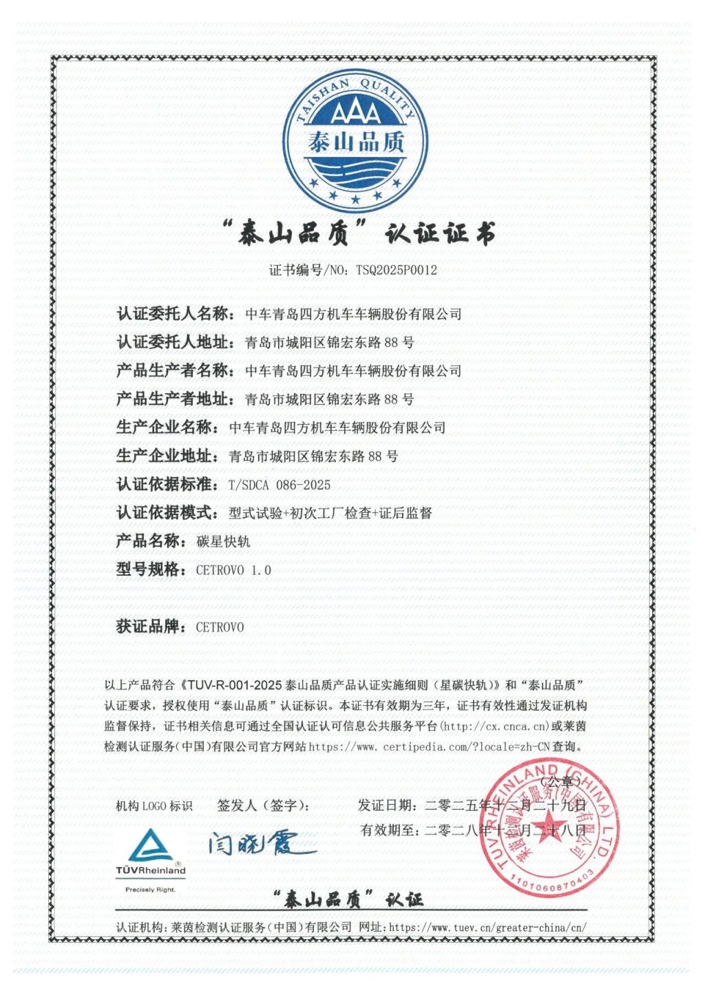 中车四方始终坚持“实施质量经营,履行质量标准,满足客户需求”的质量方针,统筹推进市场开拓、技术创新、管理提升与品牌建设,持续推进产品质量提升。此前,公司时速350公里复兴号CR400AF动车组曾获“泰山品质”认证,此次碳星快轨再获此认证,体现了对公司技术创新、质量管控与绿色发展理念的高度认可。